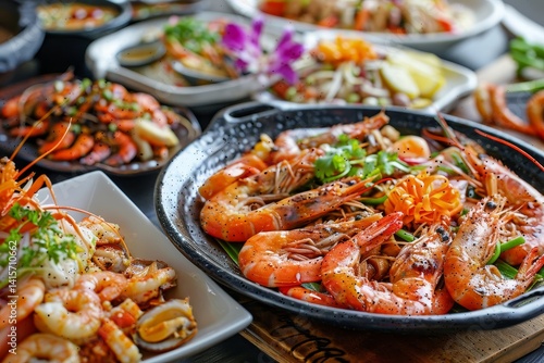 Closeup of a delicious seafood dish with prawns, served in a black skillet, Colorful array of seafood dishes