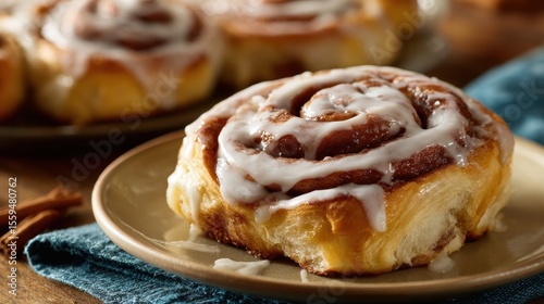 Close-up of a delicious soft cinnamon roll with glazed icing on a golden plate, warm baked pastry with swirl design, cozy morning treat with a rustic background