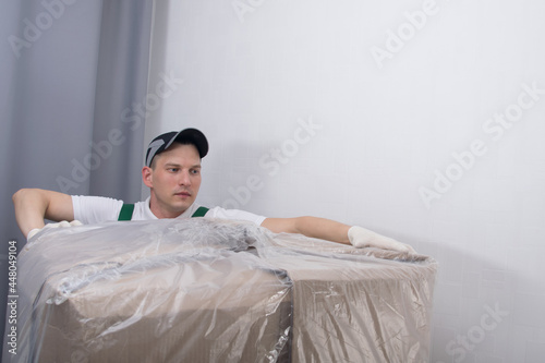 close-up of a delivery courier moving a large box, manually, there is space for the inscription