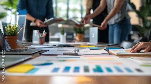 Close-up of a desk with a laptop, papers, and a hand pointing at a graph during a business meeting.