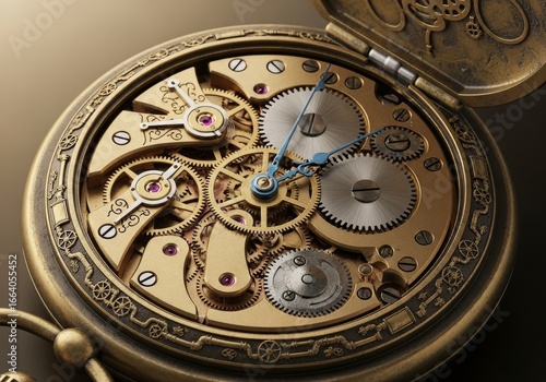 Close-up of a detailed antique pocket watch mechanism, showcasing intricate gears and components.