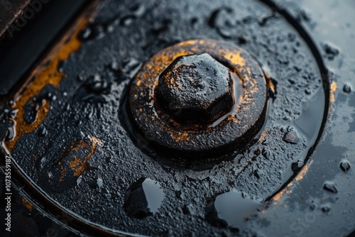 Close-Up of a Diesel Engine Radiator Cap with Coolant Stains and Oil Residue, Highlighting Maintenance Concerns and Potential Leaks on a Mechanics Workspace