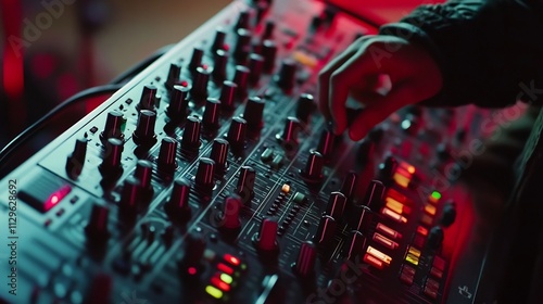 Close-up of a DJ's Hand Adjusting a Mixing Console During a Vibrant Performance