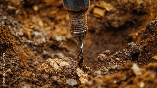 Close-up of a drill bit penetrating the earth, showcasing the textures and details of the soil.