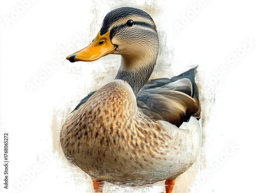 close-up of a duck with detailed feathers and bright orange beak standing against a light textured background