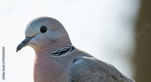 Close-up of a Eurasian collared dove, grey/pink with black striped neck