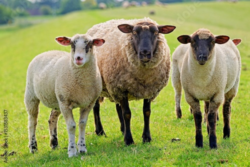 Close-up of a ewe standing in a field with three lambs, East Frisia, Lower Saxony, Germany