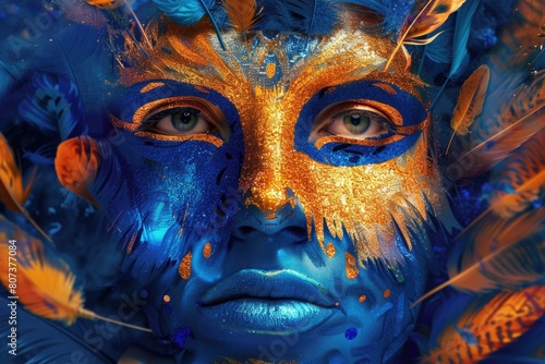 Close-up of a face painted in blue and orange, suitable for artistic projects