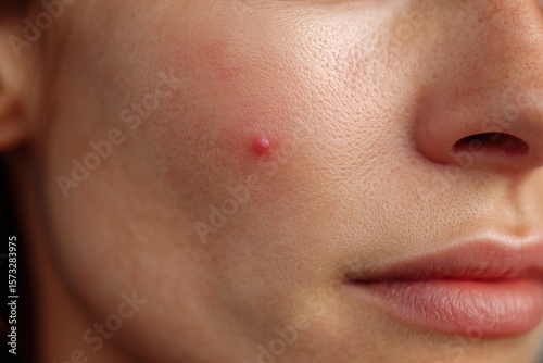 Close-up of a facial skin blemish on the cheek, showing a single red bump with irritated surrounding skin