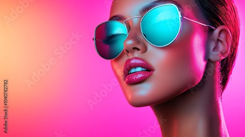 Close-up of a fashion model wearing blue sunglasses, against a pink background with neon lights.