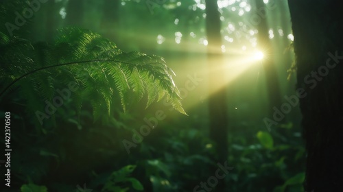 Close-up of a fern leaf in the foreground, with the sun shining through the trees in the background. the sun is shining brightly, creating a warm glow that illuminates the scene.