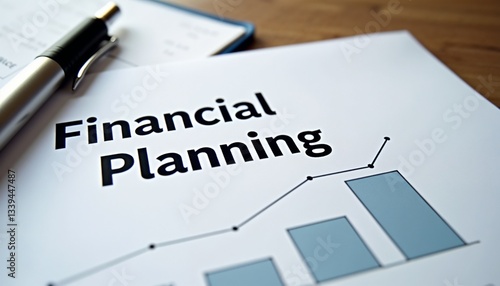 Close-up of a financial planning document with an upward trend chart and a pen on a wooden surface