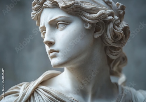 Close-up of a finely detailed marble statue of a young woman with flowing hair and draped clothing, showing a serious and thoughtful expression