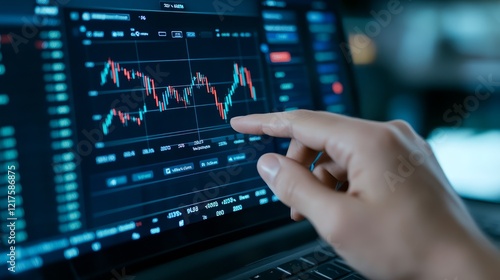 Closeup of a finger pointing at computer screen displaying data analysis results.