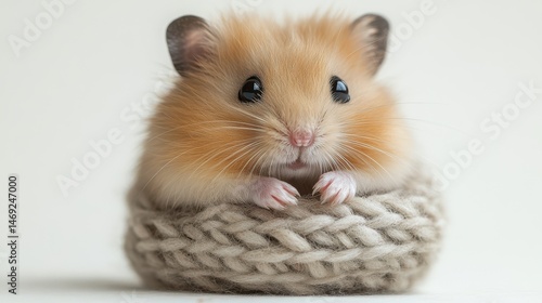 Close-up of a fluffy golden hamster sitting upright, tiny paws held together, curious black eyes sparkling, isolated on pure white background with soft shadows