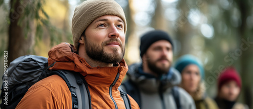 Close-up of a forest ranger with a tour group, emphasizing feelings and nature.
