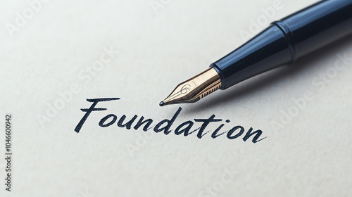 Close-up of a fountain pen writing the word 'Foundation' on a textured paper, symbolizing the establishment of principles and values.