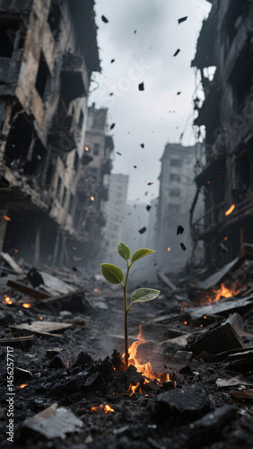 Close-up of a fragile seedling emerging from burnt ruins in a war-torn urban wasteland covered in smoke and floating ash