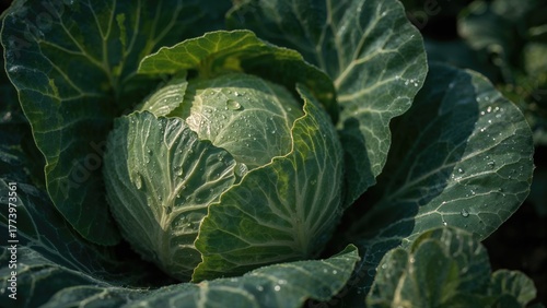 Close-up of a fresh cabbage plant with dew droplets, showcasing its green, leafy head among dark green leaves.