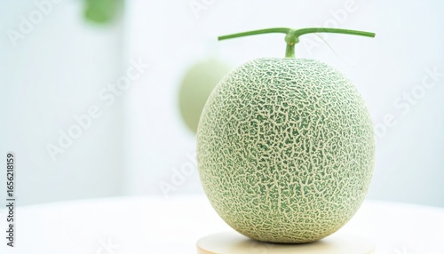 Close-up of a fresh green melon with a textured surface, set against a white background, showcasing minimalist and modern food photography.