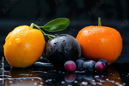 Close-up of a fresh orange, lemon, and purple plum with water droplets on a glossy dark surface, highlighting their vibrant colors.