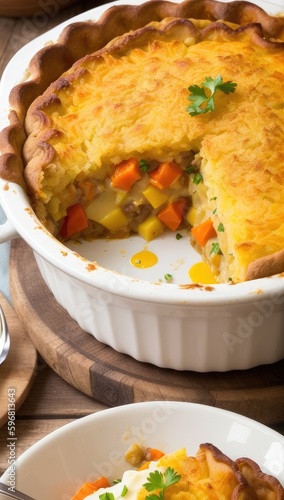 Close-up Of a freshly Baked Cottage Pie, with golden-brown mashed potatoes on top and a bubbling filling of minced beef and vegetables, served in a rustic ceramic dish. Generative AI