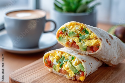Close-up of a freshly prepared breakfast wrap filled with scrambled eggs vegetables and cheese on a wooden cutting board with a cup of coffee in the background