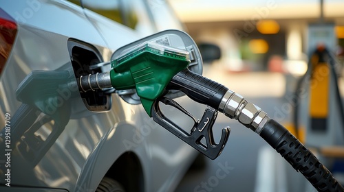 Close-up of a fuel pump nozzle inserted into a car's gas tank at a busy gas station