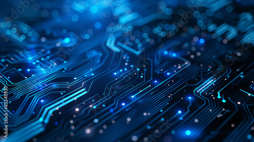 Close-up of a futuristic blue digital circuit board with glowing lines and dots, illustrating high-tech technology and electronic innovation.