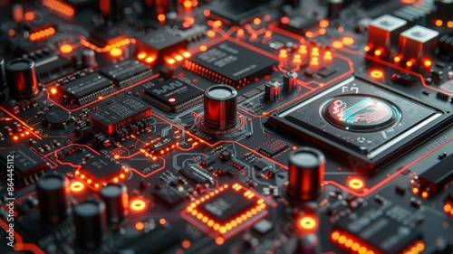 Close-up of a futuristic circuit board with glowing red LED lights, showcasing intricate pathways and components on a high-tech motherboardtechnology