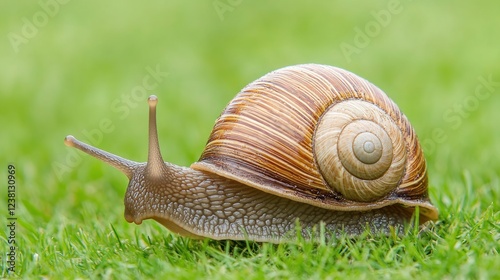 Close-up of a Garden Snail on Lush Green Grass Surrounded by Natural Environment and Soft Lighting