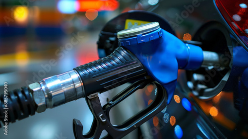 Close-up of a gasoline pump nozzle inserted into a car's fuel tank at a gas station, highlighting refueling process and transportation.