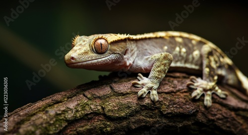 Close-up of a gecko resting on a tree branch in a natural habitat
