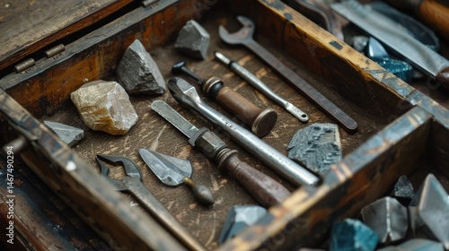 Close-up of a geologist's toolkit. stock photo --ar 16:9 --raw --v 6 Job ID: 082a9fcc-a8ce-4b8d-9f72-d5b9c7bdfc0a