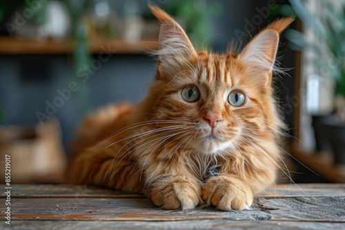 Close-up of a ginger Maine Coon cat lying on a wooden table, perfect for pet care or lifestyle themes.
