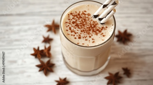 Close-up of a glass of creamy milkshake with cinnamon and star anise on a wooden table.