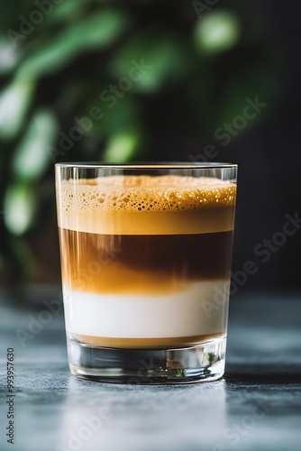 Close-up of a Glass of Layered Coffee with Foamy Top.