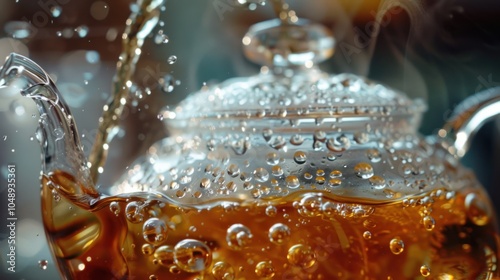 Close-up of a Glass Teapot with Steaming Tea and Water Droplets