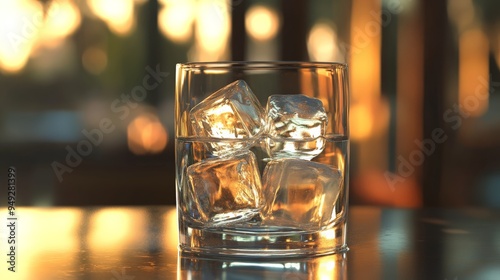 Close-up of a glass with ice cubes on a reflective surface in warm ambient lighting, great for beverage or refreshment concepts.