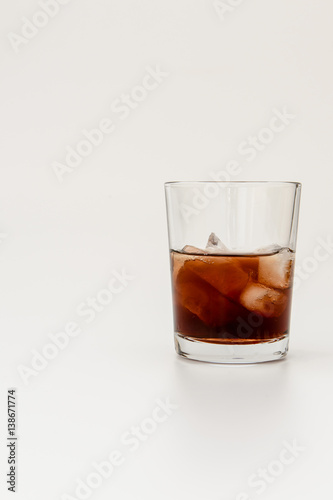 closeup of a glass with rum on ice, isolated on white background