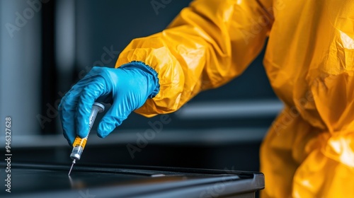 Close-up of a gloved hand preparing a syringe in a laboratory setting, highlighting safety and precision in medical procedures.