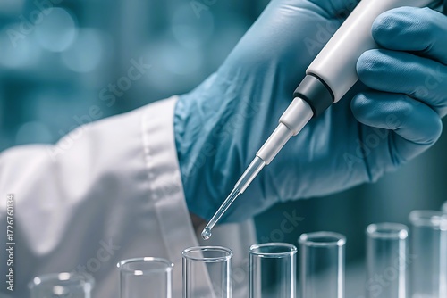 Close-up of a gloved hand using a pipette to transfer liquid into glass test tubes, emphasizing laboratory precision, sterile conditions, and scientific accuracy.