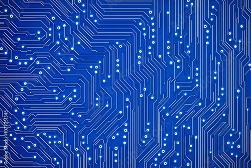 Close-up of a glowing neon circuit board pattern, showcasing intricate lines and electronic pathways in a vibrant blue hue