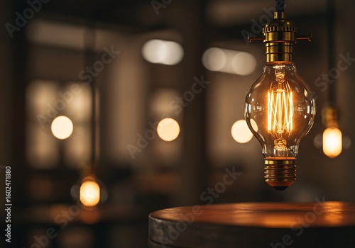 Close-up of a glowing vintage Edison light bulb with warm orange filaments, creating a cozy and ambient lighting effect with blurred background.