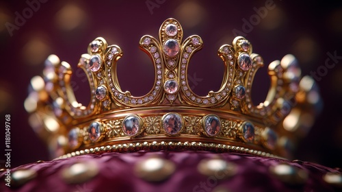 Close-up of a golden crown adorned with jewels, resting on a velvet cushion.