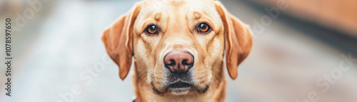 Close-up of a golden Labrador retriever with expressive eyes, showcasing loyalty and friendliness in a cozy indoor setting.