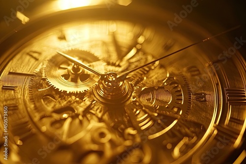 Close-up of a golden watch face with intricate gears and a delicate hand pointing towards the center