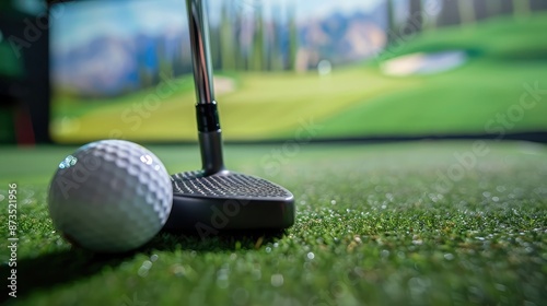 Close-up of a golf ball and putter on a screen displaying a virtual golf course, capturing the essence of indoor screen golf