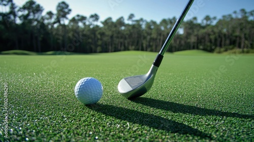 Close-up of a golf club poised to strike a white golf ball on the green, with the lush fairway stretching out in the background.