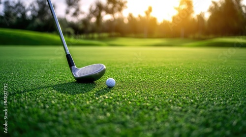 Close-up of a golf club resting on the green next to a neatly placed golf ball, with a well-maintained course in the background
